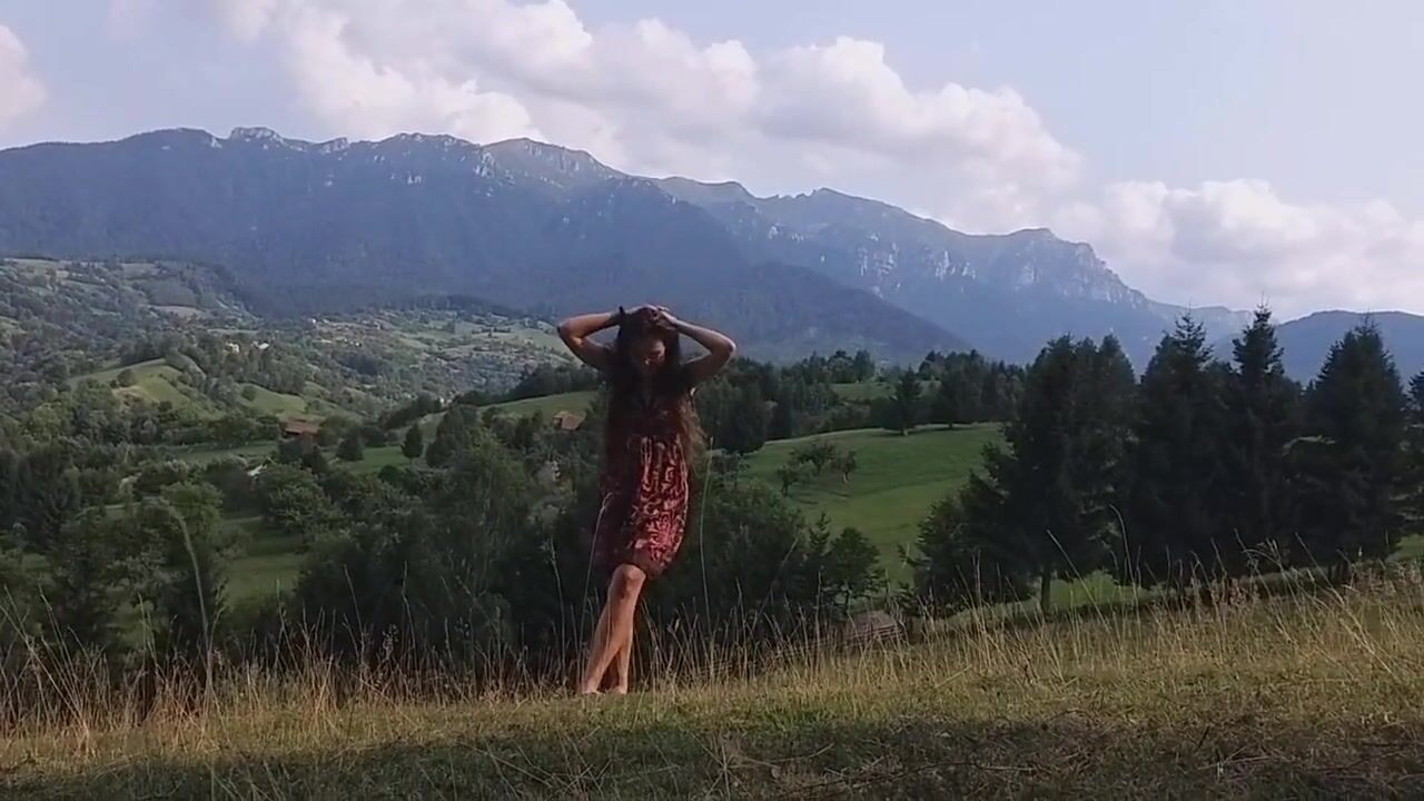 A naughty couple's outdoor adventure in the Swiss mountains includes public sex, with a focus on close-ups of her hairy pussy being fucked and creampied, as well as her long pussy lips and small tits.