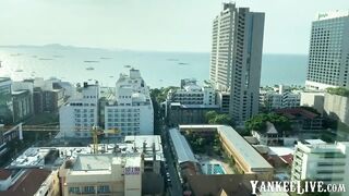 An amateur Asian couple filmed themselves in a hotel room. She gives an amazing blowjob and handjob, sucking his dick POV style, and finally takes his cum in her mouth.