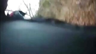 Two men enjoy a passionate outdoor encounter, with one on his knees, eagerly sucking his partner's cock in the woods, moaning with pleasure as he tastes the cum.